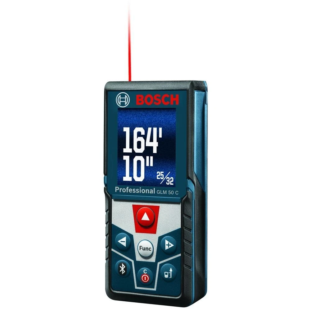 The Bosch GLM 50 CX offers a backlit color display with large numbers to easily see measurements, letters and words to provide simplicity when using its array of features. In addition to screen enhancements, the GLM 50 CX offers Bluetooth functionality, so users can digitally transfer measurements to a smartphone or tablet. Extreme accuracy of 1/16 in.; unit has great range at 165 ft. The GLM 50 CX offers multiple modes; 3 indirect measurement modes including multi-surface area. A built-in inclinometer allows the user to determine the angle of pitch and confirm when the tool is level. Includes stakeout measurement that pinpoints recurring marks along a line, e.g. every 6 in.